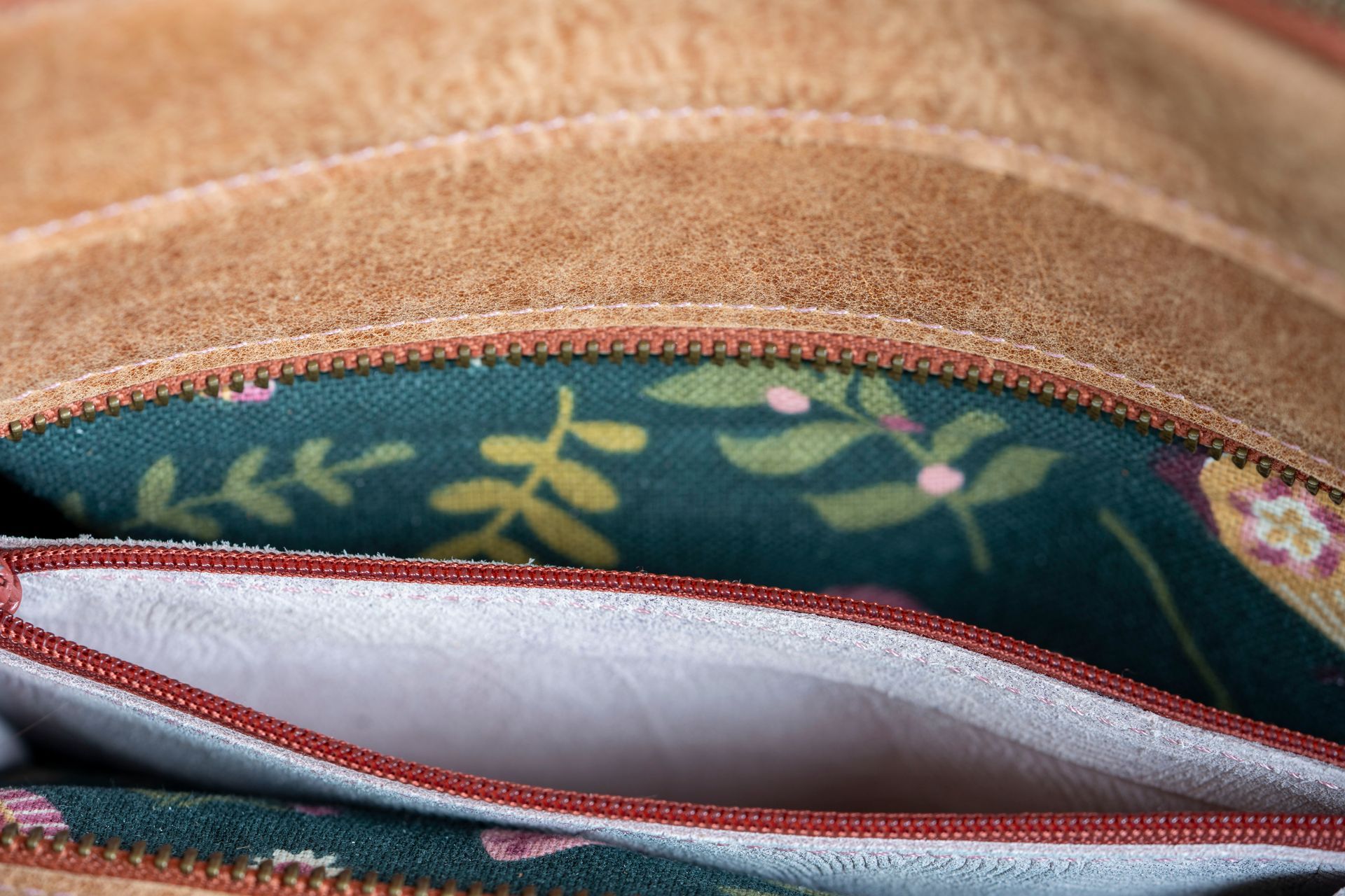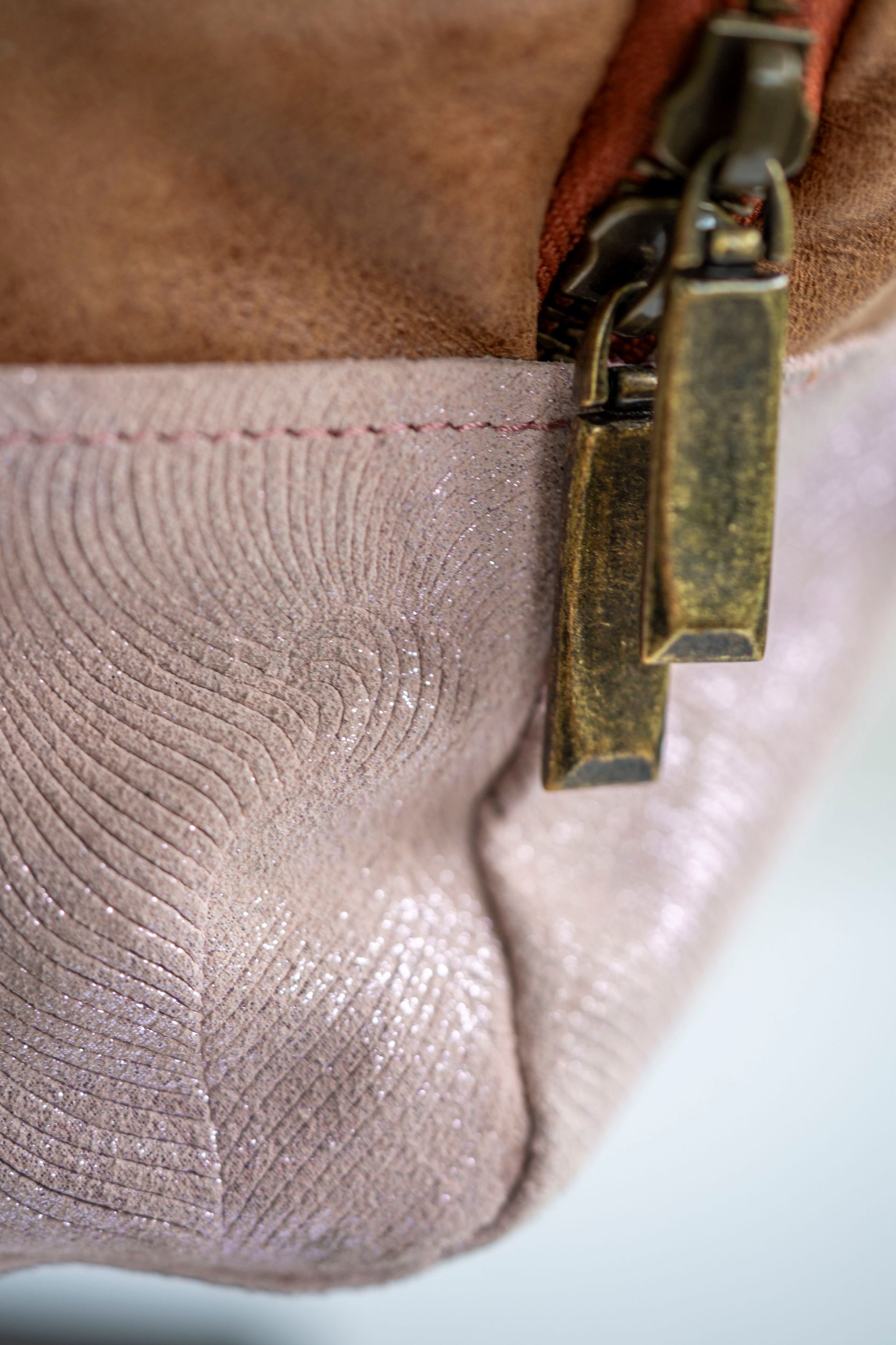 Het materiaal: De tas is gemaakt van bruin rundleer met roze details.