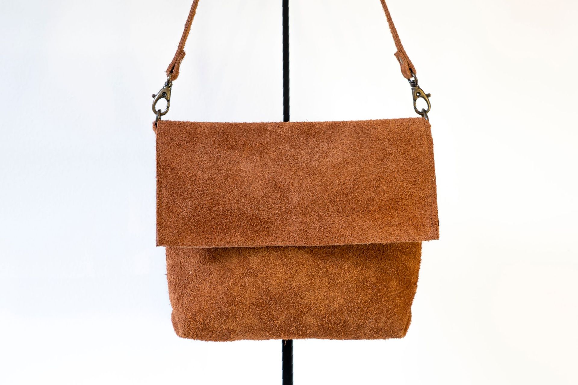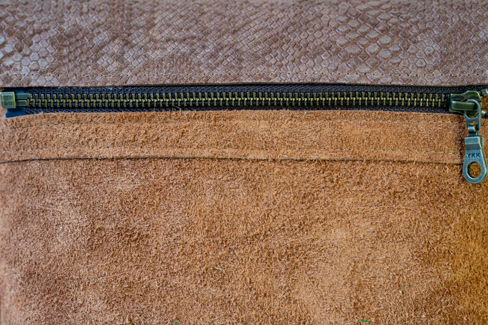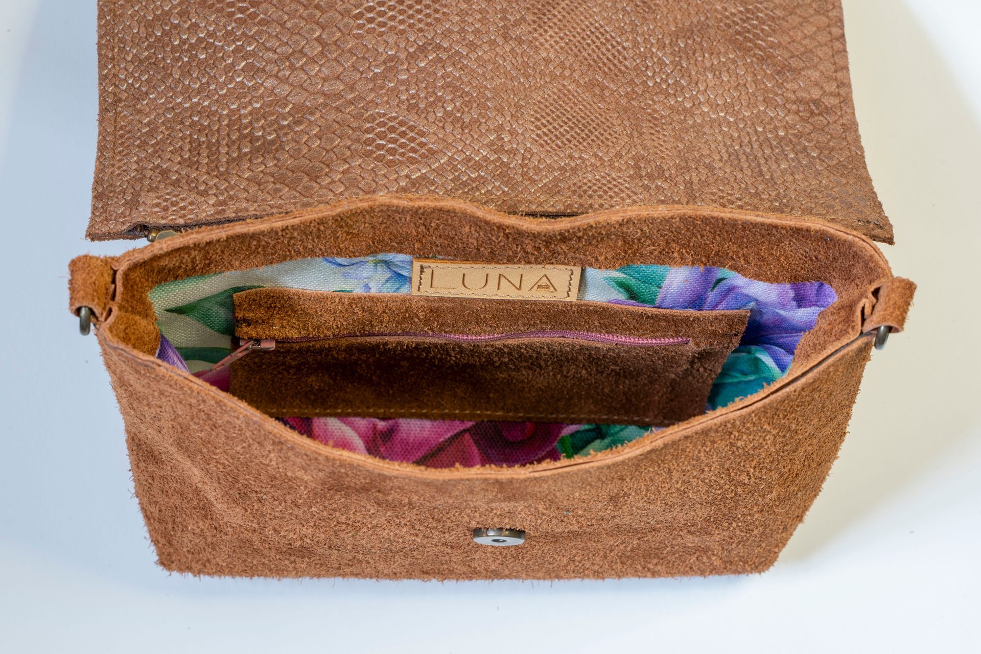 Het materiaal: De tas is gemaakt van bruin suède rundleer. Één klep is gemaakt van licht glimmend bruin rundleer met krokodillenprint, de andere klep is gemaakt van hetzelfde suède als de tas.