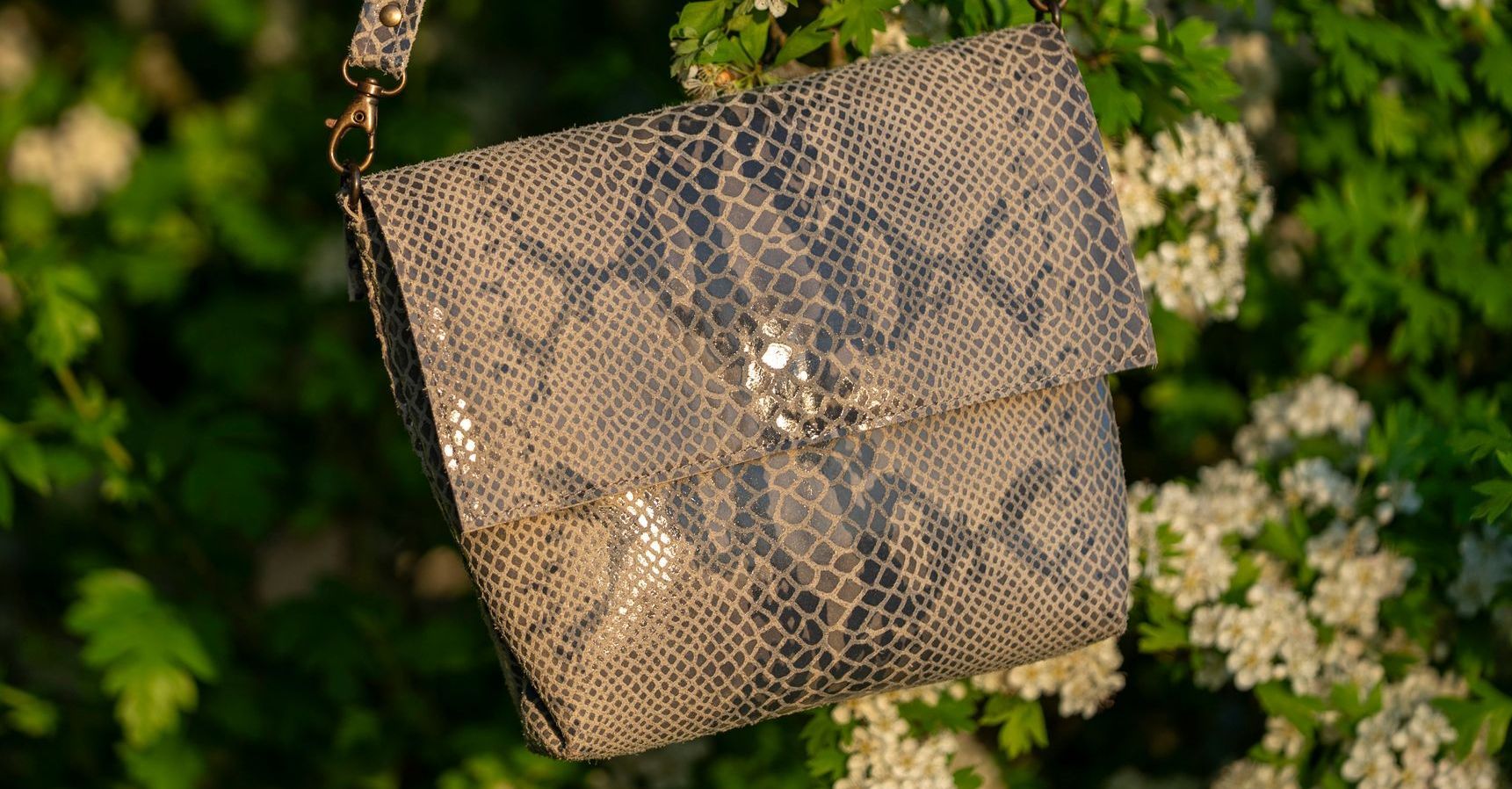 Het materiaal: De tas is gemaakt van rundleer met een slangenprint. Één klep is gemaakt van hetzelfde rundleer met dezelfde print als de buitentas, de andere klep is gemaakt van zwart rundleer.